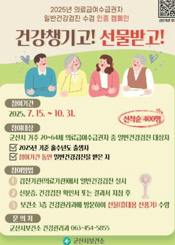 Âü¿© ´ë»óÀº ±º»ê½Ã¿¡ °ÅÁÖÇÏ´Â 20~64¼¼ ÀÇ·á±Þ¿©¼ö±Þ±ÇÀÚ Áß È¦¼ö³âµµ Ãâ»ýÀÚ·Î Ä·ÆäÀÎ ±â°£ ³»(7¿ù 15ÀÏ~10¿ù 31ÀÏ) ÀϹݰǰ°ËÁøÀ» ¿Ï·áÇÑ ½Ã¹ÎÀÌ´Ù.
