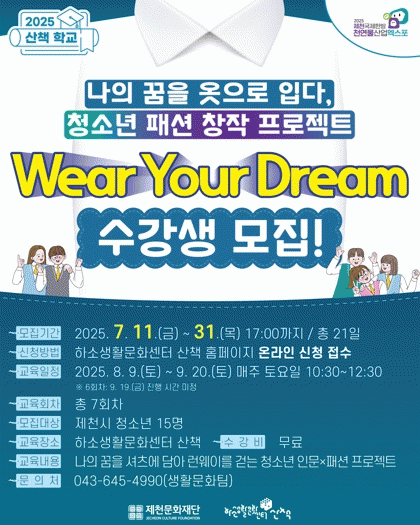 ÃÑ 7ȸÂ÷·Î ±¸¼ºµÈ À̹ø ÇÁ·Î±×·¥Àº Àι®°ú ÆÐ¼ÇÀÌ À¶ÇÕµÈ Ã¢ÀÛ Á᫐ ¼ö¾÷À¸·Î, Á¦Ãµ½Ã û¼Ò³â 15¸íÀ» ´ë»óÀ¸·Î 8¿ù 9ÀϺÎÅÍ 9¿ù 20ÀϱîÁö ¸ÅÁÖ Åä¿äÀÏ ÇϼһýȰ¹®È¼¾ÅÍ »êÃ¥¿¡¼ ÁøÇàµÉ ¿¹Á¤ÀÌ´Ù.