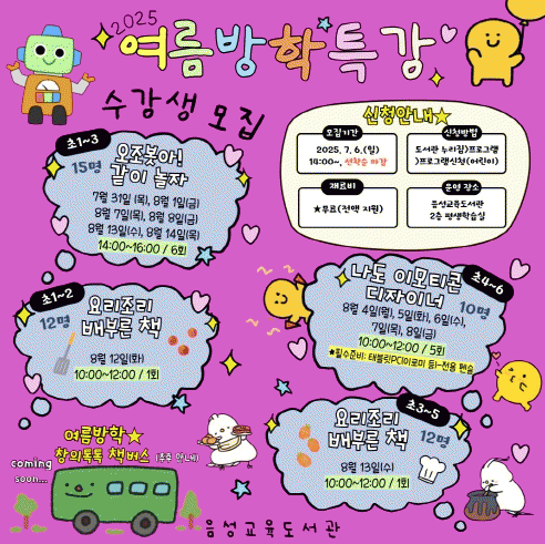 ¡ã¡®¿ÀÁ¶º¿¾Æ! °°ÀÌ ³îÀÚ¡¯(7.31.~8.14.): Ãʵî ÀúÇгâÀ» ´ë»óÀ¸·Î ¿ÀÁ¶º¿À» Ȱ¿ëÇÑ ³îÀÌÇü ÄÚµù Ȱµ¿ ¡ã¡®³ªµµ À̸ðƼÄÜ µðÀÚÀ̳ʡ¯(8.4.~8.8.): ÃÊµî °íÇгâÀ» À§ÇÑ µðÁöÅÐ µå·ÎÀ× ¹× À̸ðƼÄÜ Á¦ÀÛ ±³À° ¡ã¡®¿ä¸®Á¶¸®, ¹èºÎ¸¥ Ã¥¥°¡¯(8.12.): Ãʵî ÀúÇг⠴ë»ó Àü·¡µ¿È¿Í ¿¬°èÇÑ ÀÎÀý¹Ì ¸¸µé±â üÇè ¡ã¡®¿ä¸®Á¶¸®, ¹èºÎ¸¥ Ã¥¥±¡¯(8.13.): ÃÊµî °íÇгâÀ» À§ÇÑ ½Ò°Á¤ ¸¸µé±â üÇè ¡ã ¡®Ã¢ÀÇÅåÅå Ã¥¹ö½º¡¯(7.31., 8.13.): Ã¥¹ö½º¿¡¼ ÁøÇàµÇ´Â µ¶¼ ³îÀÌ È°µ¿À¸·Î, À¯¾ÆºÎÅÍ Çкθð, Áö¿ª ÁֹΠ¸ðµÎ Âü¿© °¡´É