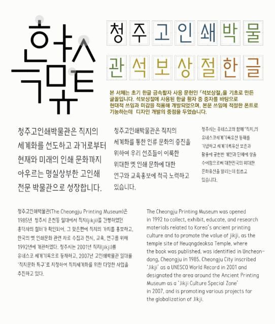 Áö±Ý±îÁö Çѱ۱ݼÓȰÀÚ¸¦ Ȱ¿ëÇÑ ¼Ã¼´Â ´ëºÎºÐ Å« ±ÛÀÚ¸¦ »ç¿ëÇØ ÁÖ·Î Á¦¸ñ¿ëÀ¸·Î »ç¿ëÇϱ⿡ ÀûÇÕÇßÀ¸³ª, ûÁÖ ¼®º¸»óÀýü´Â º»¹® ¾²ÀÓ¿¡ ÀûÀýÇϵµ·Ï Áß°£ Å©±â ±ÛÀÚ¸¦ ±âº» »À´ë·Î »ç¿ëÇØ Ȱ¿ëµµ¸¦ ³ô¿´´Ù.