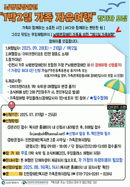 ÀÎõ½Ã»çȸ¼ºñ½º¿ø ¼Ò¼Ó ÀÎõÀå¾ÖÀÎÁ¾ÇÕº¹Áö°üÀº Àå¾ÖÀΰ¡Á·µ¹º½ ÈÞ½Ä Áö¿ø»ç¾÷ ¡®1¹Ú2ÀÏ °¡Á· ´Üü¿©Ç࡯¿¡ Âü°¡ÇÒ °¡Á·À» ¸ðÁýÇÑ´Ù°í 14ÀÏ ¹àÇû´Ù.