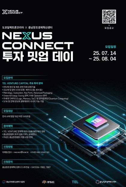 À̹ø ¡®Nexus Connect ÅõÀÚ ¹Ô¾÷ µ¥ÀÌ¡¯´Â Àü±¹ ¼ÒÀç ¾÷·Â 10³â À̳» ºñ»óÀå ½ºÅ¸Æ®¾÷À» ´ë»óÀ¸·Î, µµÄìÀÏ·ºÆ®·ÐÄÚ¸®¾Æ(TEL VENTURE CAPITAL)¿ÍÀÇ Àü·«Àû Çù¾÷ ¹× ÅõÀÚ ¿¬°è¸¦ ¸ñÀûÀ¸·Î ÃßÁøµÈ´Ù. ¸ðÁý ´ë»ó ºÐ¾ß´Â ¡â¹ÝµµÃ¼ Àåºñ ¹× Á¦Á¶ °ü·Ã ¹Ì·¡ °øÁ¤±â¼ú ¡â½Å¼ÒÀç ¹× Àåºñ H/W(·Îº¿, Á¦¾î½Ã½ºÅÛ, ¼¾¼ µî) ¡âMetrology, Subsystem, Key Parts, Advanced Packaging ¡âGreen ¡¤ Energy Saving Àåºñ ¹× FAB Operation ±â¼ú ¡âÂ÷¼¼´ë µð¹ÙÀ̽º(Logic, Memory, SoC), ¾çÀÚÄÄÇ»ÆÃ(Quantum Computing) ¡â¹ÝµµÃ¼ °ü·Ã S/W µîÀ¸·Î, ¹ÝµµÃ¼ Àü »ýŰè¿ÍÀÇ ±â¼úÀû ½Ã³ÊÁö°¡ ±â´ëµÇ´Â ±â¾÷ÀÌ ÁÖ¿ä Çù¾÷ ´ë»óÀÌ´Ù.