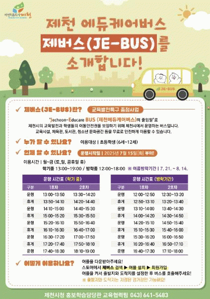 ¡®Á¦¹ö½º¡¯´Â Á¦Ãµ¿¡µàÄɾî¹ö½º(Jecheon-Educare BUS)ÀÇ ÁÙÀÓ¸»·Î, ÃʵîÇлýÀÇ ¹æ°ú ÈÄ À̵¿À» Áö¿øÇÏ´Â ¼ö¿äÀÀ´äÇü ¹ö½º´Ù. µµ¼°ü, û¼Ò³â½Ã¼³, üÀ°½Ã¼³, ¹®È°ø°£ µî Áö¿ª ³» ´Ù¾çÇÑ ±³À°¡¤µ¹º½½Ã¼³À» ¿¬°áÇÏ¿©, ÇлýµéÀÇ Æí¸®ÇÏ°í ¾ÈÀüÇÑ À̵¿À» Áö¿øÇÒ ¿¹Á¤ÀÌ´Ù.