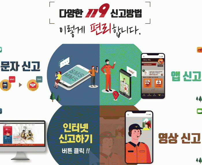 ¡®119 ´Ù¸Åü ½Å°í ¼ºñ½º¡¯´Â ±âÁ¸ À½¼ºÅëÈ ¹æ½Ä ¿Ü¿¡µµ ¹®ÀÚ(SMS), ¿µ»óÅëÈ, ½º¸¶Æ®Æù ¾ÖÇø®ÄÉÀ̼Ç, À¥»çÀÌÆ® µî ´Ù¾çÇÑ ¹æ¹ýÀ¸·Î 119¿¡ ½Å°íÇÒ ¼ö ÀÖµµ·Ï Áö¿øÇÏ´Â ½Ã½ºÅÛÀÌ´Ù.