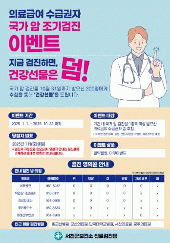 À̺¥Æ® ´ë»óÀº 2025³â 1¿ù 1ÀϺÎÅÍ 10¿ù 31ÀϱîÁö ±¹°¡ ¾Ï °ËÁø 6Á¾(À§¾Ï, °£¾Ï, ´ëÀå¾Ï, À¯¹æ¾Ï, ÀڱðæºÎ¾Ï, Æó¾Ï) Áß 1Á¾ ÀÌ»óÀ» ¼ö°ËÇÑ ÀÇ·á±Þ¿© ¼ö±Þ±ÇÀÚÀ̸ç, ¸ðµç °ËÁø Ç׸ñÀº º»Àκδ㠾øÀÌ ¹«·á·Î Á¦°øµÈ´Ù.