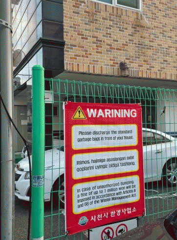 »çõ½Ã´Â °ü³» ¿Ü±¹ÀÎ ÁÖ¹ÎÀÇ ¾²·¹±â ºÐ¸®¹èÃâ ÀÎ½Ä °³¼±°ú ºÒ¹ýÅõ±â ¿¹¹æÀ» À§ÇØ ¿Ü±¹ÀÎ ¹ÐÁý °ÅÁÖÁö¿ªÀÎ »çõÀ¾¿¡ ¿µ¾î¡¤¿ìÁ¾î µî 2°³ ±¹¾î·Î Ç¥±âÇÑ Çö¼ö¸·À» ¼³Ä¡Çß´Ù°í 15ÀÏ ¹àÇû´Ù.