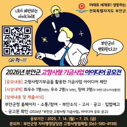 À̹ø °ø¸ðÀüÀº °íÇâ»ç¶û±â±ÝÀ» Ȱ¿ëÇØ ÃßÁøÇÒ ¼ö ÀÖ´Â ´Ù¾çÇÑ ±â±Ý»ç¾÷ ¾ÆÀ̵ð¾î¸¦ ¹ß±¼Çϱâ À§ÇØ ¸¶·ÃµÆ´Ù. ȯ°æ, ¾î¸£½Å, û³â, ¾î¸°ÀÌ º¹Áö µî ´Ù¾çÇÑ ºÐ¾ß¿¡¼ Áö¿ª¿¡ ÇÊ¿äÇÑ ¾ÆÀ̵ð¾î¸¦ Á¦¾ÈÇÒ ¼ö ÀÖµµ·Ï Çß´Ù.