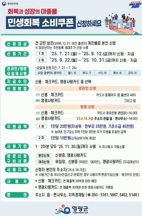 ¹Î»ýȸº¹ ¼ÒºñÄíÆù »ç¿ëÁö¿ªÀº 2025³â 6¿ù 18ÀÏ ±âÁØ Áֹεî·Ï»ó ÁÖ¼ÒÁö¿¡¼ Áö¿ø±ÝÀ» ½Åû Áö±Þ¹ÞÀº ÈÄ Áö¿ª ³»¿¡¼ »ç¿ëÇ쵂 ½Å¿ë?üũīµå´Â ¿¬ ¸ÅÃâ¾× 30¾ï ¿ø ÀÌÇÏ ¼Ò»ó°øÀÎ ¾÷Á¾¿¡¼ ¿µ±¤»ç¶ûÄ«µå´Â 30¾ï ¿ø ÀÌÇÏ »óǰ±Ç °¡¸ÍÁ¡¿¡¼ »ç¿ëÀÌ °¡´ÉÇϸç, »ç¿ë±âÇÑÀº 11¿ù 30ÀϱîÁö·Î ±â°£ ³» ¹Ì»ç¿ë Àܾ×Àº Àü¾× ȯ¼öµÈ´Ù.