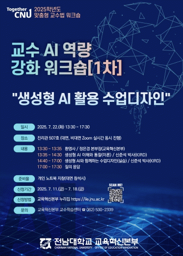 ÀÌ·¯ÇÑ ÇÁ·Î±×·¥ÀÇ ÀÏȯÀ¸·Î, ±³¿ø AI ¿ª·® °È 1Â÷ ¿öÅ©¼óÀÌ ¿À´Â 7¿ù 22ÀÏ¿¡ ´ë¸é ¹× ºñ´ë¸é(Zoom ½Ç½Ã°£) ¹æ½ÄÀ¸·Î µ¿½Ã¿¡ °³ÃֵȴÙ.