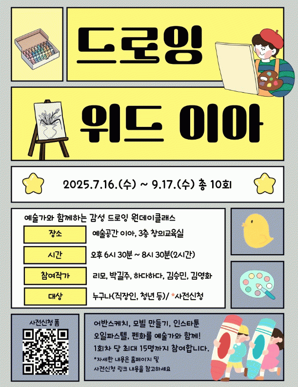 Âü¿© ÀÛ°¡µéÀº °¢±â ´Ù¸¥ ³»¿ëÀÇ ¾ÆÆ® Ŭ·¡½º¸¦ ¿î¿µÇÑ´Ù. ¡ã¸®¸ð ÀÛ°¡ÀÇ '¿øµµ½É ¾î¹Ý½ºÄÉÄ¡'¸¦ ½ÃÀÛÀ¸·Î ¡ã¹Ú±æÁÖ ÀÛ°¡ÀÇ '»õ¸¦ ±×·Á¿ä, Çϴÿ¡ ¶ç¿ö¿ä!', ¡ãÇÏ´ÙÇÏ´Ù ÀÛ°¡ÀÇ 'ÀÏ»óÀ» ¸¸È·Î! ÀνºÅ¸Å÷ ±×¸®±â', ¡ã±è½Â¹Î ÀÛ°¡ÀÇ '¿ÀÀÏÆÄ½ºÅÚ: ³» ÀÏ»óÀ» ±×¸²À¸·Î', ¡ã±è¿µÈ ÀÛ°¡ÀÇ 'ÆæÀ¸·Î ±×¸®´Â Èæ¹é ¼¼»ó'ÀÌ À̾îÁø´Ù. ÀÛ°¡º°·Î 2ȸ¾¿, ÃÑ 10ȸÂ÷ ÇÁ·Î±×·¥ÀÌ ¸¶·ÃµÇ¾î ÀÖ´Ù.