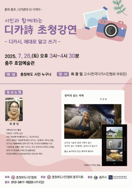 ÃæºÏ½ÃÀÎÇùȸ´Â 7¿ù 26ÀÏ ¿ÀÈÄ 3½Ã ÃæÁÖ È£¾Ï¿¹¼ú°ü¿¡¼ Çѱ¹µðÄ«½ÃÀÎÇùȸ ÃÖ±¤ÀÓ ºÎȸÀåÀ» ÃÊÃ»ÇØ ¡®µðÄ«½Ã, Á¦´ë·Î ¾Ë°í ¾²±â¡¯¸¦ ÁÖÁ¦·Î °¿¬È¸¸¦ ¿¬´Ù.