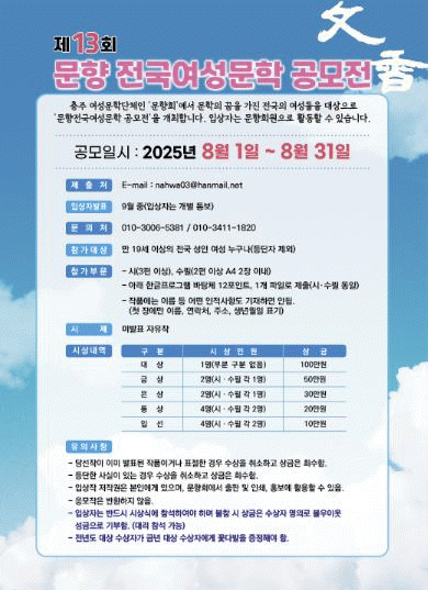 À̹ø °ø¸ðÀüÀº ½Ã¿Í ¼öÇÊ µÎ ºÎ¹®À¸·Î ÁøÇàµÇ¸ç, 8¿ù 1ÀϺÎÅÍ 31ÀϱîÁö ÀÛǰÀ» Á¢¼ö¹Þ´Â´Ù.