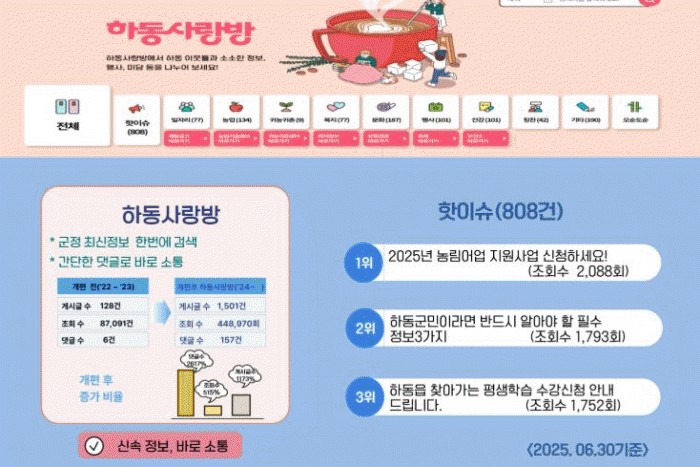 ¡ÞÁ¤Ã¥ ¼ÒÅëÀÇ Çãºê, ¡®Çϵ¿»ç¶û¹æ¡¯ = ¡®Çϵ¿»ç¶û¹æ¡¯Àº 2024³â 2¿ùºÎÅÍ ±âÁ¸ ÀÚÀ¯°Ô½ÃÆÇÀ» °³ÆíÇØ ±ºÁ¤ ¼Ò½Ä°ú »ýȰ¡¤º¹Áö µî °¢Á¾ ÇàÁ¤ Á¤º¸¸¦ ½Ç½Ã°£ Á¦°øÇÏ´Â °ø½Ä Æ÷ÅзÎ, ±º¹Î ¼ÒÅëÀÇ ´ëÇ¥ ⱸ·Î ºÒ¸°´Ù.