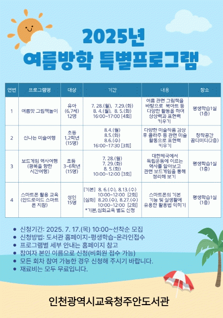 ÇÁ·Î±×·¥Àº À¯¾ÆºÎÅÍ ¼ºÀαîÁö ´Ù¾çÇÑ ¿¬·ÉÃþÀÌ Âü¿©ÇÒ ¼ö ÀÖµµ·Ï ±¸¼ºµÆÀ¸¸ç ¡ãÀ¯¾Æ(6~7¼¼) ´ë»ó ¡®¿©¸§¸À ±×¸²Ã¥³îÀÌ¡¯ ¡ãÃʵî 1,2Çг⠴ë»ó ¡®½Å³ª´Â ¹Ì¼ú¿©Ç࡯ ¡ãÃʵî 3~6Çг⠴ë»ó ¡®º¸µå°ÔÀÓ ¿ª»ç¿©Çà-±¤º¹À» ÇâÇÑ ½Ã°£¿©Ç࡯, ¡ã ¼ºÀÎ ´ë»ó ¡®½º¸¶Æ®Æù Ȱ¿ë ±³À°¡¯ µîÀÌ´Ù.