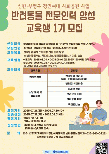 ¹Ý·Áµ¿¹° ¾÷Á¾ Ãë¾÷À» Èñ¸ÁÇÏ´Â ºÎÆò °ÅÁÖ Ã»³â(¸¸19¼¼~39¼¼)À̶ó¸é ¿À´Â 21ÀϺÎÅÍ 30ÀϱîÁö Æ÷½ºÅÍ ³» Å¥¾Ë(QR)ÄÚµå·Î Âü¿© ½ÅûÇÒ ¼ö ÀÖ´Ù. ¸éÁ¢À» °ÅÃÄ ÃÑ 20¸íÀÌ ¼±¹ßµÉ ¿¹Á¤ÀÌ´Ù.