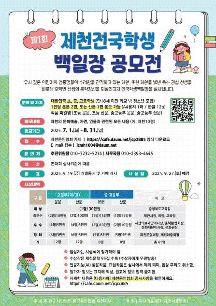 Âü°¡ ´ë»óÀº ´ëÇѹα¹ ÃÊ¡¤Áß¡¤°íµîÇлý(18¼¼ ¹Ì¸¸ Çб³ ¹Û û¼Ò³â Æ÷ÇÔ)À̸ç, Á¦ÃµÀÇ ¹®È¿¹¼ú, ÀÚ¿¬ µî Á¦Ãµ°ú °ü·ÃÇÑ ¸ðµç ÁÖÁ¦¸¦ ´ë»óÀ¸·Î ¿î¹®°ú »ê¹® ÀÛǰÀ» ÀÀ¸ðÇÒ ¼ö ÀÖ´Ù. ÀÀ¸ð±â°£Àº 8¿ù 31ÀϱîÁö´Ù.