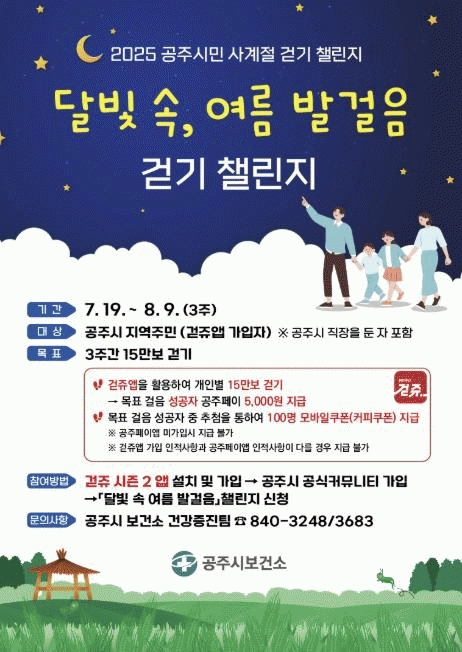 µÎ ¹øÂ°·Î ÁøÇàµÇ´Â ¡®´Þºû ¼Ó ¿©¸§ ¹ß°ÉÀ½¡¯ 縰Áö´Â ¿À´Â 7¿ù 19ÀϺÎÅÍ 8¿ù 9ÀϱîÁö 3ÁÖ°£ ÁøÇàµÈ´Ù. Âü¿©ÀÚ´Â ½º¸¶Æ®Æù °È±â ¾ÖÇø®ÄÉÀÌ¼Ç ¡®°ÈÁê ½ÃÁð2¡¯¸¦ Ȱ¿ëÇØ ÃÑ 15¸¸ º¸ °È±â¸¦ ¸ñÇ¥·Î Çϸç À̸¦ ´Þ¼ºÇÑ »ç¶÷¿¡°Ô´Â Áö¿ª ÈÆóÀÎ ¡®°øÁÖÆäÀÌ¡¯°¡ Áö±ÞµÈ´Ù.
