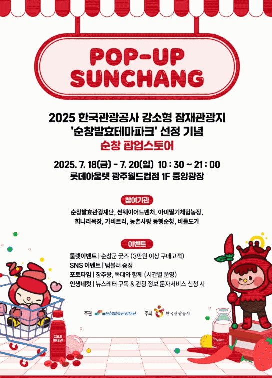 À̹ø ÆË¾÷½ºÅä¾î´Â 2025³â Çѱ¹°ü±¤°ø»ç °¼ÒÇü ÀáÀç°ü±¤Áö·Î¡®¼øÃ¢¹ßÈ¿Å׸¶ÆÄÅ©¡¯°¡ ¼±Á¤µÈ °ÍÀ» ±â³äÇØ, ¼øÃ¢ °íÀ¯ÀÇ ¹ßÈ¿ ¹®È¿Í °ü±¤ÀÚ¿ø, Áö¿ª »óǰ, ij¸¯ÅÍ ±ÂÁî µîÀ» µµ½Ã¹Î¿¡°Ô ¼Ò°³Çϰí Áö¿ª °ü±¤ È«º¸¿Í ¸¶ÄÉÆÃÀ» È®´ëÇϱâ À§ÇØ ¸¶·ÃµÆ´Ù.