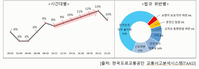 ½Ã°£´ëº°·Î´Â ¿ÀÀü 10½ÃºÎÅÍ »ç°í°¡ Á¡Â÷ Áõ°¡ÇØ ¿ÀÈÄ 9½Ã ÀüÈÄ·Î ÇÏ·ç Áß °¡Àå ¸¹Àº »ç°í(13%)°¡ ¹ß»ýÇß´Ù.