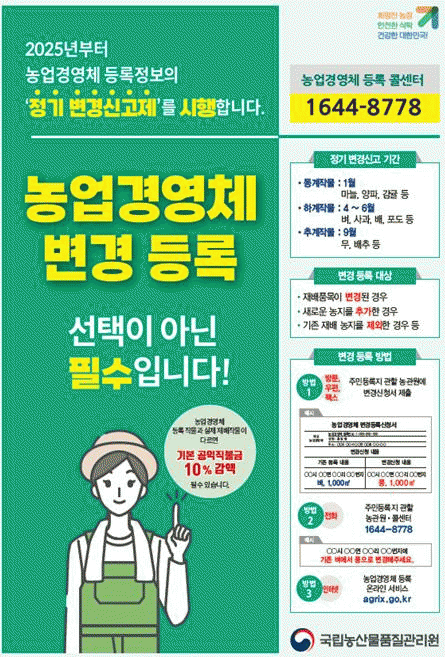 ³ó¾÷°æ¿µÃ¼ µî·Ï ³ó¾÷ÀÎÀº °øÀÍÁ÷ºÒ±Ý µî ³ó¾÷ °ü·Ã À¶ÀÚ?º¸Á¶±Ý ÇýÅÃÀ» ¹Þ´Â ´ë½Å Àç¹èǰ¸ñ¡¤³óÁö µîÀÌ º¯°æµÉ °æ¿ì ¹Ýµå½Ã ³ó°ü¿ø¿¡ º¯°æ½Å°í¸¦ ÇØ¾ß ÇÏ´Â Àǹ«°¡ ÀÖ´Ù.