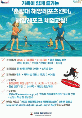 À̹ø ÇÁ·Î±×·¥Àº ÃáÀå´ë ÇØ¾ç·¹Æ÷Ã÷¼¾Å͸¦ °ÅÁ¡À¸·Î, ¹«·á ÆÐµéº¸µå(SUP) üÇè ±³À°À» Á¦°øÇÑ´Ù.