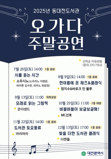 ¡®¿À°¡´Ù¡¯´Â µµ¼°üÀ» ¿À°¡¸ç ÀÚ¿¬½º·´°Ô ¹®È¿Í ¿¹¼úÀ» Áñ±âµµ·Ï ±âȹµÈ ÇÁ·Î±×·¥À¸·Î, µ¿´ëÀüµµ¼°ü 1Ãþ ·Îºñ¿Í ¾ß¿Ü¹«´ë, °´ç µî ¿¸° °ø°£¿¡¼ ´©±¸³ª ÀÚÀ¯·Ó°Ô °ü¶÷ÇÒ ¼ö ÀÖµµ·Ï ¸¶·ÃµÆ´Ù. °ø¿¬Àº ¼º¾Ç, ÀçÁî, »÷µå¾ÆÆ®, ¹öºí¼î, ±¹¾Ç, Ŭ·¡½Ä µî ´Ù¾çÇÑ À帣·Î ±¸¼ºµÅ ³²³à³ë¼Ò ¸ðµÎ°¡ Áñ±æ ¼ö ÀÖ´Â ÄÜÅÙÃ÷·Î ä¿öÁ³´Ù.