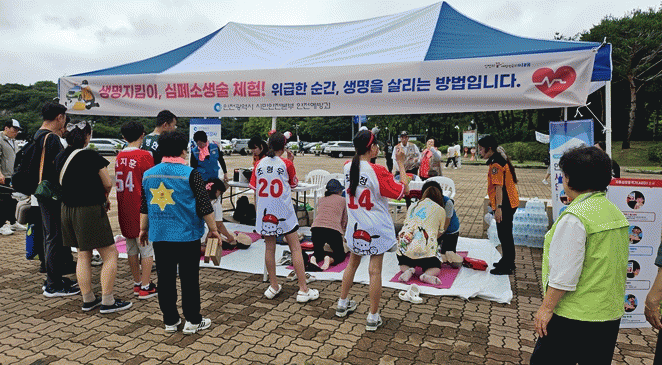 ÇöÀå¿¡¼´Â °æ±â½ÃÀÛ Àü °æ±âÀå ³» °üÁßµéÀ» ´ë»óÀ¸·Î ¼Ò¹æº»ºÎ ±¸±Þ´ë¿øµéÀÌ ½ÉÀå ¾Ð¹Ú µîÀÇ ½ÉÆó¼Ò»ý¼ú(CPR) ½Ç½À½Ã¿¬À» Á÷Á¢ ÁøÇàÇßÀ¸¸ç °æ±âÀå ¿ÜºÎ¿¡¼´Â ½ÉÆó¼Ò»ý¼ú üÇè ºÎ½º¸¦ º°µµ·Î ¼³Ä¡ÇØ °æ±âÀåÀ» ãÀº °ü¶÷°´µéÀÌ Á÷Á¢ ½ÉÆó¼Ò»ý¼ú(CPR)À» üÇèÇϸç ÇнÀÇÒ ¼ö ÀÖµµ·Ï Çß´Ù. À̸¦ ÅëÇØ ¾ß±¸ÀåÀ» ãÀº ½Ã¹ÎµéÀÌ ½±°í Ä£¼÷ÇÏ°Ô ¡®»ý¸íÁöÅ´ÀÌ¡¯ ¿ªÇÒÀ» ÀÌÇØÇϰí ÀÍÈú ¼ö ÀÖµµ·Ï Çß´Ù.
