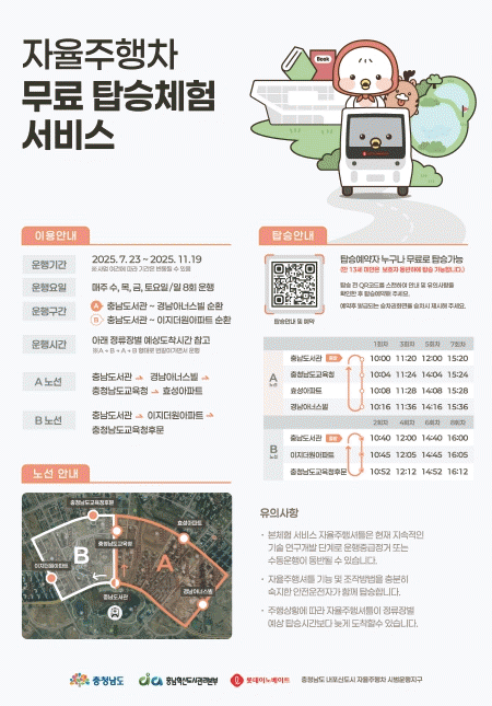 üÇèÀº ÀÚÀ²ÁÖÇà ¼ÅÆ²¿¡ ½Â°´ 8¸í±îÁö ¾ÈÀü¿ä¿ø°ú ÇÔ²² ž½ÂÇØ ¿îÇàÇϸç, A³ë¼±(Ãæ³²µµ¼°ü¡µµ±³À°Ã»¡È¿¼º¾ÆÆÄÆ®¡°æ³²¾Æ³Ê½ººô¡Ãæ³²µµ¼°ü)°ú B³ë¼±(Ãæ³²µµ¼°ü¡ÀÌÁö´õ¿ø¾ÆÆÄÆ®¡µµ±³À°Ã» ÈĹ®¡Ãæ³²µµ¼°ü)À» 1ȸ¾¿ ¹ø°¥¾Æ °¡¸ç ¼øÈ¯ÇÏ´Â ¹æ½ÄÀÌ´Ù.