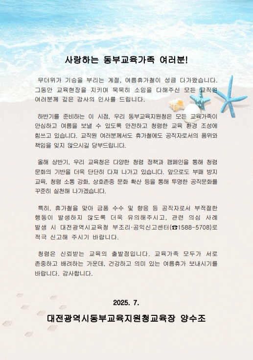 ´ëÀüµ¿ºÎ±³À°Áö¿øÃ» ¾ç¼öÁ¶ ±³À°ÀåÀº ¡°Ã»·ÅÀº ½Å·Ú¹Þ´Â ±³À°ÀÇ Ãâ¹ßÁ¡¡±À̶ó¸ç¡°±³À°°¡Á· ¸ðµÎ°¡ ¼·Î Á¸ÁßÇÏ°í ¹è·ÁÇÏ´Â °¡¿îµ¥, °Ç°Çϰí ÀÇ¹Ì ÀÖ´Â ¿©¸§ÈÞ°¡¸¦ º¸³»½Ã±â¸¦ ¹Ù¶õ´Ù¡±°í ¸»Çß´Ù.