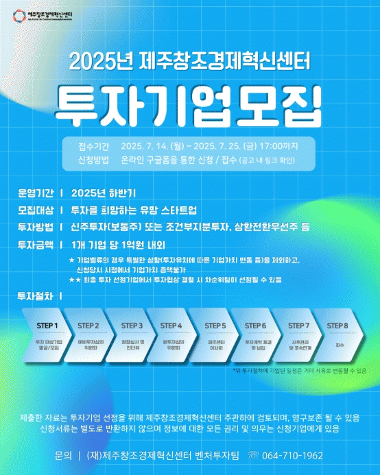 ½ÅûÀº ¿À´Â 25ÀÏ(±Ý) ¿ÀÈÄ 5½Ã±îÁö Á¦ÁÖâÁ¶°æÁ¦Çõ½Å¼¾ÅÍ È¨ÆäÀÌÁö¿¡¼ °¡´ÉÇϸç, ÃÖÁ¾ ÅõÀÚ°è¾àÀº 9¿ù Áß ¸¶¹«¸®µÈ´Ù. ÇϹݱ⠳»¿¡ ÀÚ±ÝÁ¶´ÞÀÌ ÇÊ¿äÇÑ ±â¾÷À̶ó¸é ´«¿©°Üº¼ ¸¸ÇÏ´Ù.