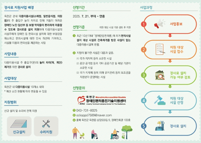 ÀÌ »ç¾÷Àº Àå¾ÖÀÎµî ÆíÀǹý¿¡ µû¸¥ ÆíÀǽü³ Àǹ« ¼³Ä¡ ½Ã¼³ÀÌ ¾Æ´Ñ ¼Ò±Ô¸ð ´ÙÁßÀÌ¿ë½Ã¼³(¼Ò¸ÅÁ¡, ÀϹÝÀ½½ÄÁ¡ µî)¿¡ ÃâÀÔ±¸ ¹®ÅÎ ¹× ³ôÀÌÂ÷¸¦ Á¦°ÅÇÏ¿© º¸Çà ¾àÀÚµéÀÇ Á¢±ÙÀÌ ¾î·Á¿î ½Ã¼³¿¡ ¸ÂÃãÇü °æ»ç·Î¸¦ Áö¿øÇÏ´Â »ç¾÷ÀÌ´Ù.