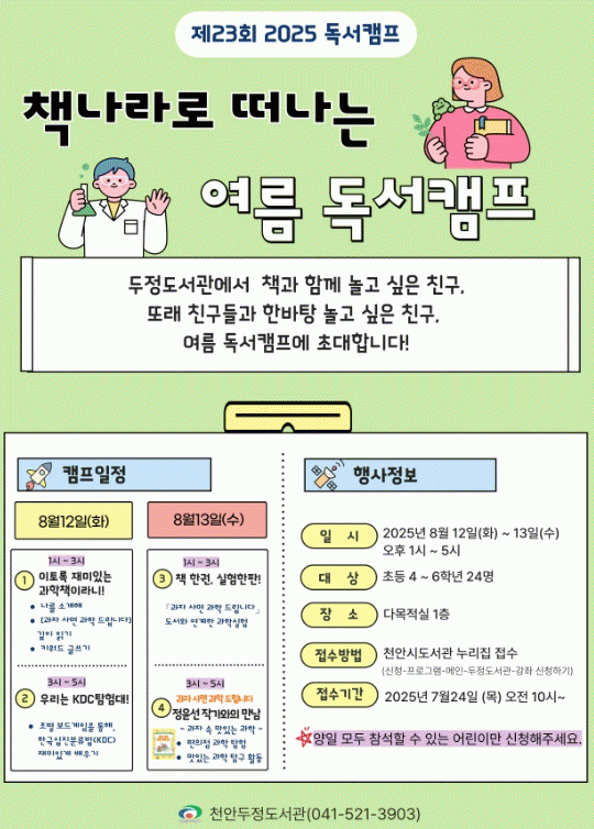 ÇÁ·Î±×·¥Àº ÃʵîÇб³ 4~6Çгâ 24¸íÀ» ´ë»óÀ¸·Î ¿î¿µµÇ¸ç, Âü¿© ½ÅûÀº ¿À´Â 7¿ù 24ÀÏ ¿ÀÀü 10½ÃºÎÅÍ Ãµ¾È½Ã µµ¼°ü ´©¸®Áý¿¡¼ ÇÏ¸é µÈ´Ù.
