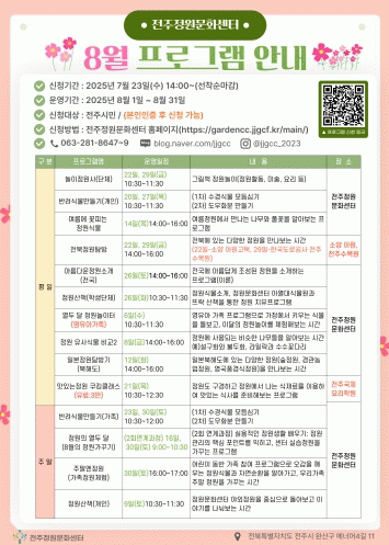 ¿À´Â 8¿ù ¿î¿µµÇ´Â ÇÁ·Î±×·¥Àº ¡âÁ¤¿øÅ½¹æ ¡â¸ÀÀÖ´ÂÁ¤¿ø ÄíŷŬ·¡½º ¡â³îÀÌÁ¤¿ø»ç ¡â¹Ý·Á½Ä¹° ¸¸µé±â µî ¾î¸°À̺ÎÅÍ Ã»¼Ò³â, ³ëÀο¡ À̸£±â±îÁö ´Ù¾çÇÑ ¿¬·ÉÃþÀ» À§ÇÑ ¸ÂÃãÇü Á¤¿ø±³À°À¸·Î ±¸¼ºµÅ ÀÖ´Ù. ¶Ç, ¡®ÁÖ¸»¿£Á¤¿ø¡¯°ú ¡®Á¤¿ø»êÃ¥¡¯ µî ¿Â°¡Á·ÀÌ ÇÔ²² Âü¿©ÇÒ ¼ö ÀÖ´Â ÁÖ¸» ÇÁ·Î±×·¥µµ ¿î¿µµÉ ¿¹Á¤ÀÌ´Ù.