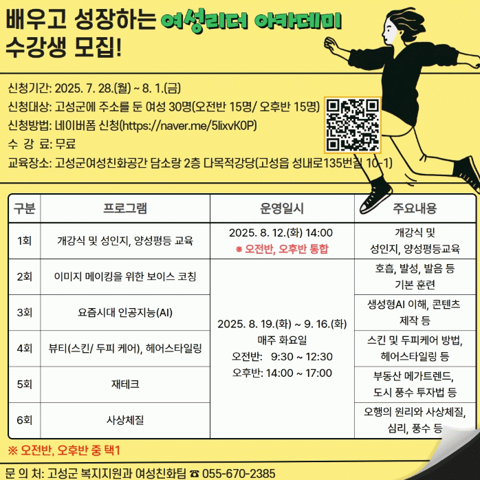 À̹ø ¾ÆÄ«µ¥¹Ì´Â 8¿ù 12ÀϺÎÅÍ 9¿ù 16ÀϱîÁö ¸ÅÁÖ È¿äÀÏ, °í¼º±º ¿©¼ºÄ£È°ø°£ ´ã¼Ò¶û 2Ãþ ´Ù¸ñÀû °´ç¿¡¼ ¿î¿µµÉ ¿¹Á¤À̸ç, ¿ÀÀü¹Ý(9:30~12:30)°ú ¿ÀÈĹÝ(14:00~17:00) Áß ¼±ÅÃÇØ¼ Âü¿©ÇÒ ¼ö ÀÖ´Ù.