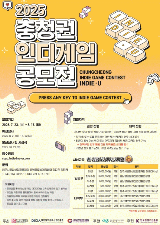 ÃæÃ»±Ç Áö¿ª °ÅÁ¡±â°üÀÎ ´ëÀü¹®È»ê¾÷ÁøÈï¿ø, Ãæ³²ÄÜÅÙÃ÷ÁøÈï¿ø°ú Çù·ÂÇØ ÁøÇàÇÏ´Â À̹ø °ø¸ðÀüÀº 2023³â ½ÃÀÛÇØ ¿ÃÇØ 3ȸ°·Î, ÃæÃ»±Ç¿ª¿¡¼ Ȱµ¿ ÁßÀÎ °ÔÀÓ °³¹ßÀÚµéÀÇ Ã¢ÀÇÀûÀÌ°í µ¶Ã¢ÀûÀÎ °ÔÀÓÀ» ¹ß±¼Çϰí, ³ª¾Æ°¡ ÃæÃ»±ÇÀÌ Àεð°ÔÀÓ °³¹ßÀÚ ³×Æ®¿öÅ©ÀÇ Çãºê°¡ µÇ°íÀÚ ÃßÁøµÆ´Ù.