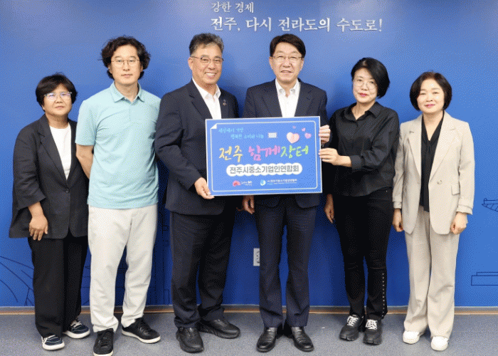 ÀüÁÖ½Ã¿Í ÀüÁÖ½ÃÁß¼Ò±â¾÷Àο¬ÇÕȸ(ȸÀå °µ¿¿À)´Â 23ÀÏ ÀüÁÖ½ÃÀå½Ç¿¡¼ ¿ì¹ü±â ÀüÁÖ½ÃÀå°ú °µ¿¿À ȸÀåÀ» ºñ·ÔÇÑ ¿¬ÇÕȸ ÀÓ¿øÁø 3¸íÀÌ Âü¼®ÇÑ °¡¿îµ¥ ¡®ÇÔ²²ÀåÅÍ ¿î¿µ ±âºÎ±Ý Àü´Þ½Ä¡¯À» °¡Á³´Ù.