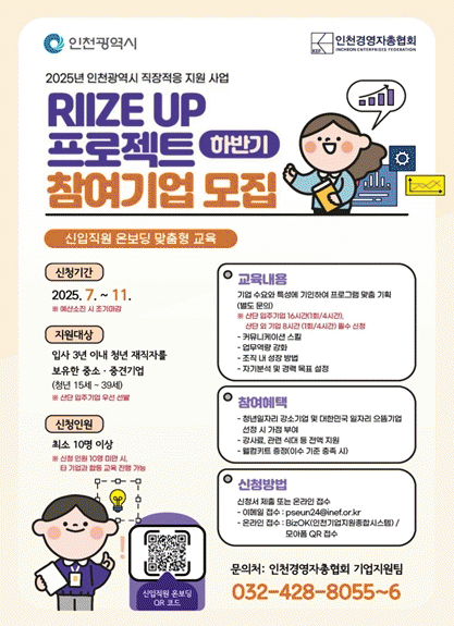 À̹ø Á÷ÀåÀûÀÀ(onboarding) ±³À°Àº ÀÔ»ç 3³â À̳», 39¼¼ ÀÌÇÏÀÇ Ã»³â ÀçÁ÷ÀÚ¸¦ ´ë»óÀ¸·Î Çϸç, ÀÎõ »ê¾÷´ÜÁö ÀÔÁÖ±â¾÷À» Æ÷ÇÔÇÑ °ü³» Áß¼Ò¡¤Áß°ß±â¾÷ÀÌ ½ÅûÇÒ ¼ö ÀÖ´Ù. ȸÂ÷´ç 10¸í ÀÌ»ó Âü¿© ÀοøÀ» È®º¸ÇÑ ±â¾÷ÀÌ¸é ½Åû °¡´ÉÇÏ°í ±³À°ºñ´Â Àü¾× ¹«·á·Î ÁøÇàµÈ´Ù.