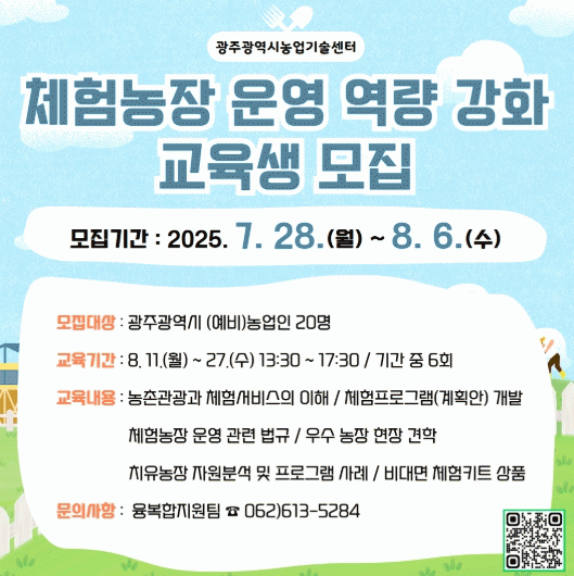 ¸ðÁý´ë»óÀº ±¤ÁÖ±¤¿ª½Ã °ÅÁÖ Ã¼Çè³óÀå ¿î¿µÀÚ ¶Ç´Â °ü½É ÀÖ´Â ½Ã¹Î 20¸íÀÌ´Ù. ±³À° Âü¿© Èñ¸ÁÀÚ´Â 8¿ù 6ÀϱîÁö ±³À°½Åû¼¿Í °ü·Ã ¼·ù¸¦ ³ó¾÷±â¼ú¼¾Å͸¦ ¹æ¹®Çϰųª À̸ÞÀÏ ¶Ç´Â ÆÑ½º·Î Á¦ÃâÇÏ¸é µÈ´Ù.
