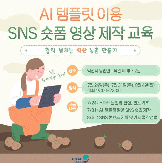 ÀÍ»ê½Ã³ó¾÷±â¼ú¼¾ÅÍ´Â 24ÀϺÎÅÍ 3ȸ(ÃÑ 9½Ã°£) °úÁ¤À¸·Î 'ÀΰøÁö´É(AI) ÅÛÇø´ ÀÌ¿ë »çȸ°ü°è¸Á¼ºñ½º(SNS) ¼ôÆû ¿µ»ó Á¦ÀÛ' ±³À°À» ÁøÇàÇÑ´Ù.