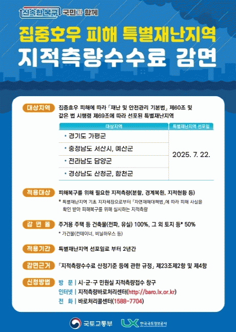 ÁÖ°Å¿ë ÁÖÅðú â°í, ³óÃà»ê¡¤»ó¾÷½Ã¼³ µîÀº ÁöÀûÃø·® ¼ö¼ö·á¸¦ Àü¾× °¨¸é¹ÞÀ» ¼ö ÀÖÀ¸¸ç, ÀÌ ¿Ü¿¡ ÇÇÇØ º¹±¸ µîÀ» À§ÇØ °æ°è³ª ÇöȲÀ» È®ÀÎÇϱâ À§ÇÑ ÁöÀûÃø·®Àº ¼ö¼ö·áÀÇ 50%¸¦ °¨¸é¹ÞÀ» ¼ö ÀÖ´Ù.