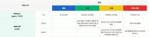 ÀÌ¿¡ µû¶ó ¿¬±¸¿øÀº ÀÎõ½Ã¸¦ ¼ºÎ, µ¿³²ºÎ, °È, ¿µÁ¾¡¤¿µÈï 4°³ ±Ç¿ªÀ¸·Î ³ª´©°í, ´ë±âÁú ¿¹Ãø ¸ðµ¨¸µ °á°ú¸¦ ¹ÙÅÁÀ¸·Î ¡®ÁÁÀ½¡¯, ¡®º¸Å롯, ¡®³ª»Ý¡¯, ¡®¸Å¿ì ³ª»Ý¡¯ 4´Ü°è µî±ÞÀÇ ¿ÀÁ¸ ¿¹º¸¸¦ ÇÏ·ç 2ȸ ±Ç¿ªº°·Î ½Ç½ÃÇϰí ÀÖ´Ù.