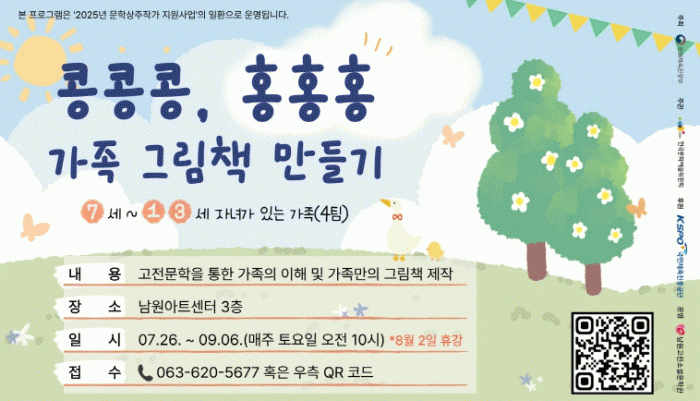 Âü°¡ ´ë»óÀº 7¼¼~13¼¼ Àڳฦ µÐ °¡Á·À¸·Î, ¼±Âø¼ø 4ÆÀÀ» ¸ðÁýÇÑ´Ù. Á¢¼ö´Â ÀüÈ(063-620-5677) ¶Ç´Â Æ÷½ºÅÍ ³» QRÄڵ带 ÅëÇØ °¡´ÉÇÏ´Ù.