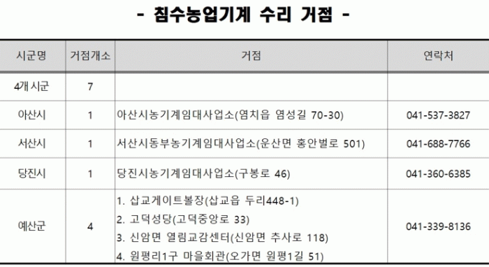 °¢ ±â°üÀº ¼ö¸® Àη°ú ³ó¾÷±â°è ¼øÈ¸±³À°Â÷·®, ¼ö¸® Àåºñ µîÀ» ÇÇÇØ Áö¿ª¿¡ ¸¶·ÃµÈ °ÅÁ¡¿¡ ÆÄ°ßÇØ ³ó¾÷±â°è 2100¿© ´ë¿¡ ´ëÇÑ ±ä±ÞÁ¡°Ë°ú Á¤ºñ¸¦ ½Ç½ÃÇÒ ¿¹Á¤ÀÌ´Ù.