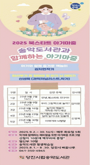9¿ù 2ÀϺÎÅÍ 9¿ù 30ÀϱîÁö È¿äÀϸ¶´Ù ÁøÇàÇϸç, ¡â±èÁö¿¬ ÀÛ°¡ÀÇ ¡®³îÀÌ¿Í ¿¹¼úÀÌ °¡µæÇÑ ¾Æ±â ¼¼»ó¡¯, ¡â½Å¼º¿í ÀÛ°¡ÀÇ ¡®¾Æ±âµéÀÇ ³ú¿¡¼´Â ¹«½¼ ÀÏÀÌ ÀϾ°í ÀÖÀ»±î?¡¯ µî ÃÑ 5ȸ °Àǰ¡ ÁغñµÅ ÀÖ´Ù. Âü¿© ´ë»óÀº ÀӽźΠ10¸íÀ¸·Î, Âü¿©ÀÚ¿¡°Ô´Â À°¾Æ¿¡ µµ¿òÀÌ µÇ´Â Ã¥ ²Ù·¯¹Ì(2±Ç)°¡ Á¦°øµÈ´Ù.