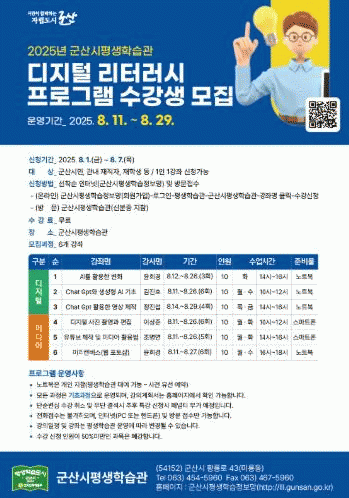 ¼ö° ½ÅûÀº 8¿ù 1ÀÏ ¿ÀÀü 9½ÃºÎÅÍ 8¿ù 7ÀÏ ¿ÀÈÄ 6½Ã±îÁö ¼±Âø¼ø ÀÎÅͳÝ(±º»ê½ÃÆò»ýÇнÀÁ¤º¸¸Á) ¹× ¹æ¹®(±º»ê½ÃÆò»ýÇнÀ°ü)À¸·Î Á¢¼ö °¡´ÉÇϸç, ¼ö°·á´Â ¹«·áÀÌ´Ù.
