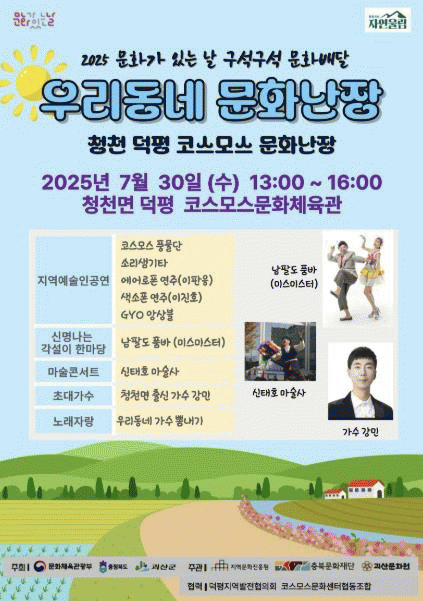 ¿À´Â 7¿ù 30ÀÏ ¿ÀÈÄ 1½ÃºÎÅÍ ¿¸®´Â À̹ø Çà»ç´Â ¡°Ã»Ãµ ´öÆò ÄÚ½º¸ð½º ¹®È³À塱À̶ó´Â ÁÖÁ¦·Î ÁøÇàµÇ¸ç, Áö³ 5¿ù ´öÆò¸®¿¡ °³°üÇÑ ÄÚ½º¸ð½º¹®ÈüÀ°°ü¿¡¼ ¿·Á ¹«´õÀ§¸¦ ½ÄÈ÷´Â ½Ç³» ¹®ÈÇà»ç·Î ²Ù¸çÁú ¿¹Á¤ÀÌ´Ù.