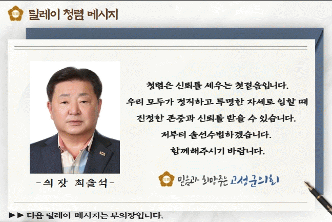 ÃÖÀ»¼® ÀÇÀåÀº ¡°Ã»·ÅÀº ½Å·Ú¸¦ ¼¼¿ì´Â ù°ÉÀ½¡±À̶ó¸ç ¡°ÀÇÀåÀ¸·Î¼ ¸ÕÀú ¸±·¹ÀÌ¿¡ Âü¿©ÇÏ°Ô µÇ¾î ¶æ±í°í, ¸ðµç ÀÇ¿øµé°ú ÇÔ²² û·ÅÇÑ °í¼º±ºÀÇȸ¸¦ ¸¸µé¾î°¡°Ú´Ù¡±°í ÀüÇß´Ù. °í¼º±ºÀÇȸ´Â ¾ÕÀ¸·Îµµ ´Ù¾çÇÑ È°µ¿À» ÅëÇØ Åõ¸íÇÏ°í ½Å·Ú¹Þ´Â Áö¹æÀÇȸ ±¸Çö¿¡ ¾ÕÀå¼³ ¹æÄ§ÀÌ´Ù.