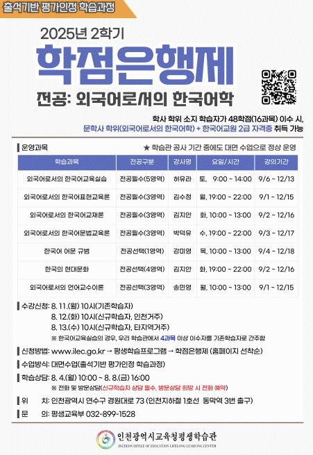 ÀÎõÆò»ýÇнÀ°üÀº 2014³âºÎÅÍ ¡®¿Ü±¹¾î·Î¼ÀÇ Çѱ¹¾îÇС¯ Àü°ø °úÁ¤À» ¿î¿µÇϰí ÀÖÀ¸¸ç, ÇØ´ç °úÁ¤ À̼ö ½Ã ¹®Çлç ÇÐÀ§¿Í ÇÔ²² Çѱ¹¾î±³¿ø 2±Þ ÀÚ°ÝÁõÀ» ÃëµæÇÒ ¼ö ÀÖ´Ù.