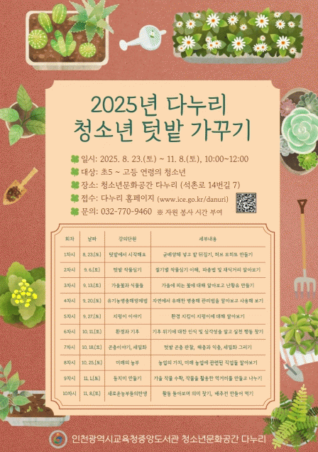 À̹ø ÇÁ·Î±×·¥Àº û¼Ò³âÀÌ Á÷Á¢ ³óÀÛ¹°À» Àç¹èÇÏ¸ç ³ó¾÷ÀÇ °¡Ä¡¿Í ±âÈÄ À§±â ´ëÀÀ ¿ª·®À» ¹è¿ì´Â üÇèÇü ±³À°À¸·Î ¡ãÀý±âº° ÀÛ¹° ½É±â ¡ãÀ¯±â³ó º´ÃæÇØ ¹æÁ¦¹ý ¡ãÅÔ¹ç °ïÃæ °üÂû°ú ¼¼¹ÐÈ ±×¸®±â ¡ã±âÈÄ À§±â¿¡ ´ëÀÀÇÏ´Â ½Çõ ¹æ¹ý ¹× ¹Ì·¡ÀÇ ³ó¾÷ ¡ãÀç¹èÇÑ ÀÛ¹°·Î µ¿Ä¡¹Ì ´ã±â µîÀ» ¿î¿µÇϸç Ȱµ¿¿¡ Âü¿©ÇÑ Çлý¿¡°Ô´Â ºÀ»ç ½Ã°£ÀÌ ÀÎÁ¤µÈ´Ù.