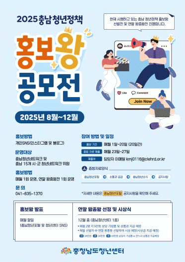 [HKSÇàÁ¤¹æ¼Û]Ãæ³²Ã»³â¼¾ÅÍ(¼¾ÅÍÀå °ÇöÁ¤)´Â 2025³â ¿À´Â 8¿ùºÎÅÍ 12¿ù±îÁö ¡®2025 Ãæ³² û³âÁ¤Ã¥ È«º¸¿Õ °ø¸ðÀü¡¯À» °³ÃÖÇÑ´Ù. À̹ø °ø¸ðÀüÀº Ãæ³² û³âµéÀÌ Á÷Á¢ û³âÁ¤Ã¥À» È«º¸Çϰí, À̸¦ ÅëÇØ ´õ ¸¹Àº û³âÀÌ Á¤Ã¥¿¡ °ü½ÉÀ» °¡Áú ¼ö ÀÖµµ·Ï ÇÏ´Â ÃëÁö¿¡¼ ±âȹµÆ´Ù.